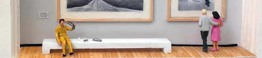 Modellbauerisch verdient die Brille besonderes Augenmerk – sie besitzt sogar Gläser. Wie man erkennt eine Lesebrille, mit der der Besucher den Ausstellungskatalog studieren kann, um sich dann wieder den fotografischen Werken zu widmen oder gar uns Betrachtern.