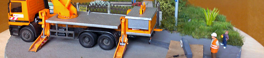 Als Auftrag für einen Freund, der einen Arbeitskollegen in den Ruhestand verabschiedete, entstand diese Szene. Der Arbeitgeber – ein großes Energieversorgungsunternehmen – schickt regelmäßig seine Leute zur Wartung und Reparatur der Beleuchtung raus. Was lag da näher, als das Diorama unter die Plexiglaskuppel einer alten Straßenlaterne zu bauen?