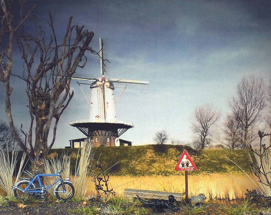 Dieses Diorama ist ein kleines Suchbild: Während das blaue Fiets noch leicht in der holländischen Szenerie zu entdecken ist, muss man die Hunde Lilly und Tyson schon aufmerksamer suchen.